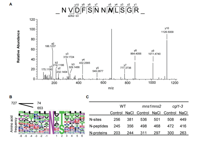 许多证据表明,植物对盐胁迫的适应性反应需要相关蛋白上加工成熟的N-聚糖参与。然而,关于在这个过程中起作用的盐响应糖蛋白知之甚少。本研究鉴定了野生型 (WT)拟南芥中的盐响应糖蛋白和两个N-聚糖成熟缺陷的突变体mns1 mns2和cgl1。通过液相色谱串联质谱 (LC-MS/MS) 进行定量分析,共鉴定出97种丰度变化 > 1.5 的蛋白质对抗盐胁迫。表明N-聚糖对于调节应激反应蛋白水平至关重要,并且列出了几种负责拟南芥耐盐胁迫的新型糖蛋白。