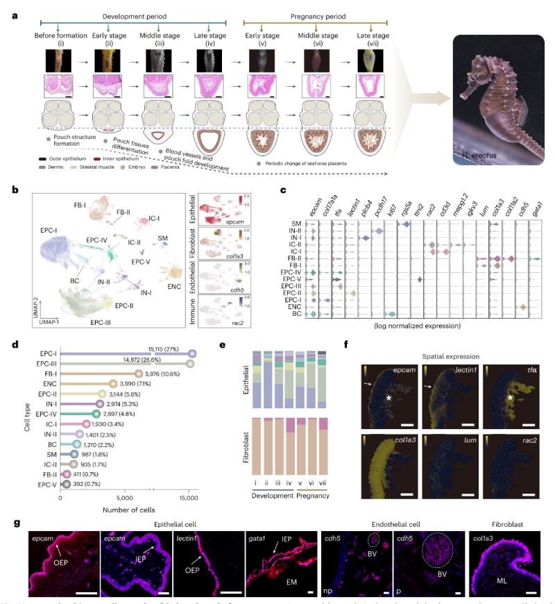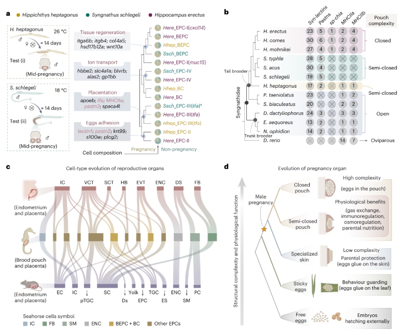 胎生是脊椎动物中广泛存在的一种生殖策略,其特征为受精卵在母体内发育,直至胚胎发育成熟后才被产出。与这一普遍模式形成鲜明对比的是,海马科物种演化出了极为特殊的“雄性怀孕”现象,该独特的生命史策略为研究动物生殖系统的演化提供了重要窗口:功能性相似的生殖方式究竟源于趋同的分子机制,抑或是通过同源通路或全新的细胞调控路径实现?尽管已有比较基因组学研究初步揭示了该生殖方式转变的遗传背景,然而相关基因在特定细胞类型中的表达模式及其演化轨迹仍不清楚。