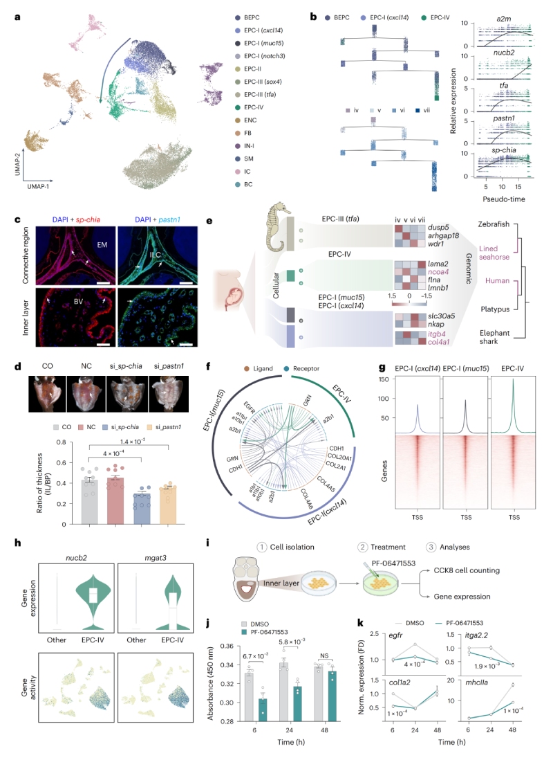 对海马育儿袋7个发育阶段进行单细胞转录组测序,鉴定出14个细胞簇,分为四大主要细胞类型:上皮细胞(EPCs,9个簇)、成纤维细胞(FBs,2个簇)、免疫细胞(ICs,2个簇)和内皮细胞(ENCs,1个簇)。细胞的空间分布对细胞间相互作用及其功能维持至关重要。