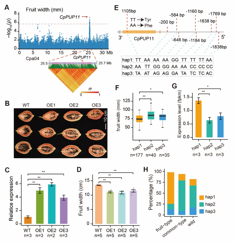图1. CpPUP11决定番木瓜果实宽度