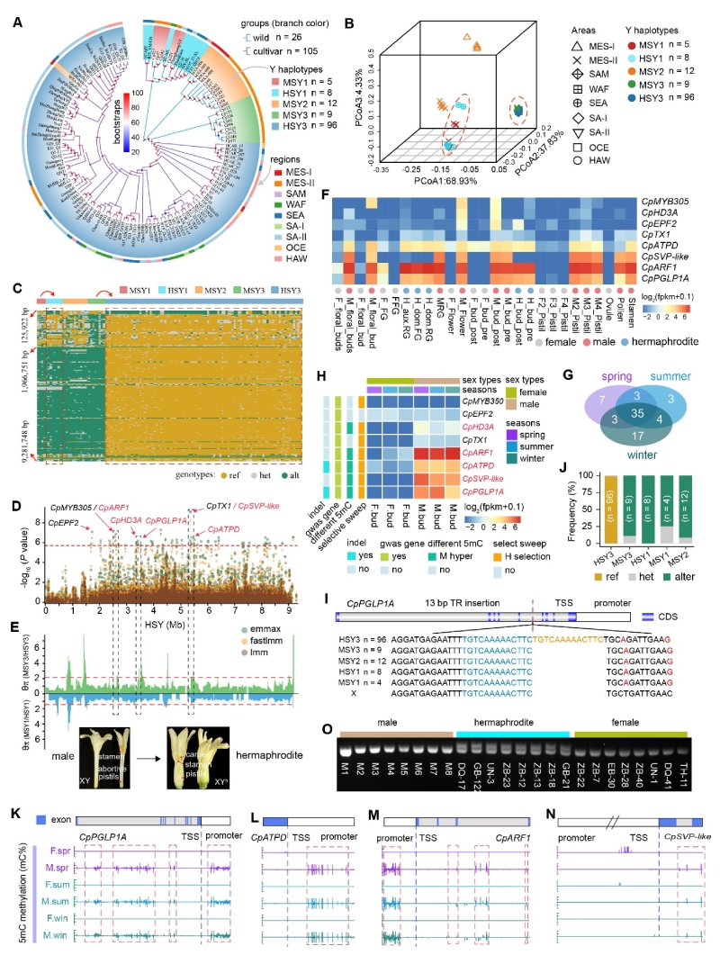 这种性别转换是由针对雄性偏好基因的选择驱动的,并在Yh连锁区域中定位了一个与性别转换密切相关13 bp串联重复结构变异(HSY3-TR-13bp)。该两性株特异性变异位于雄性偏好基因CpPGLP1A中,且被HSY3群体选择固定(图3)。