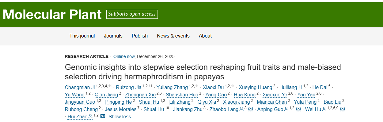 2025年12月23日,中国热科院生物所、热带作物生物育种全国重点实验室联合南方科技大学、中科院分子植物科学卓越创新中心、中国科学院大学、热科院椰子所、Nature Source Improved Plants, Mexico和百迈客生物等国内外科研单位在中科院1区Top期刊Molecular Plant(影响因子:24.1)发表了题为“Genomic insights into stepwise selection reshaping fruit traits and male-biased selection driving hermaphroditism in papayas”的最新研究论文,其中百迈客生物生信工程师戴鹤为该论文共同作者。