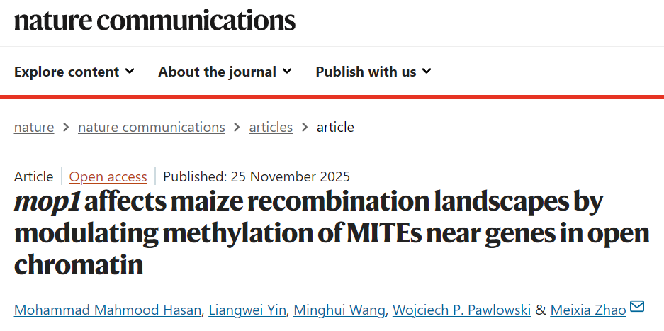 近日,佛罗里达大学的Meixia Zhao教授团队在国际顶尖期刊《Nature Communications》上发表了题为“mop1 affects maize recombination landscapes by modulating methylation of MITES near genes in open chromatin”的研究论文。