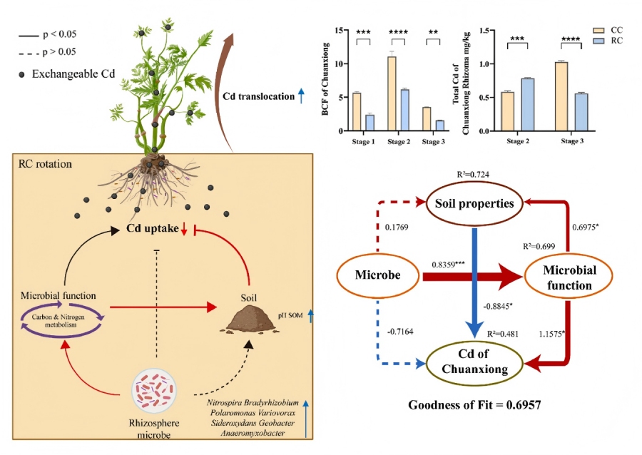 该研究采用多学科整合方法开展系统性探究:首先在四川镉污染农田设置 “稻 – 川芎轮作(RC)” 与 “川芎连作(CC)” 对照试验,追踪川芎全生育期生长指标;随后通过HPLC测定活性成分、ICP-MS分析镉含量、宏基因组解析根际微生物群落;结合土壤理化性质检测、酶活性分析,最终利用PLS-SEM模型构建 “微生物 – 功能 – 土壤性质 – 镉积累” 调控网络。研究发现: