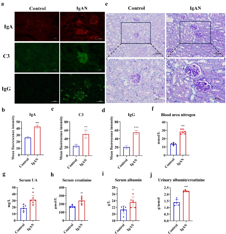 根据以上研究背景,作者首先确认了IgAN小鼠模型的成功建立。通过分析小鼠肾脏IgA免疫荧光染色,与对照组相比,IgAN组肾小球IgA(p < 0.001)、C3(p < 0.01)和IgG(p < 0.001)沉积显著增加。PAS染色显示,IgAN组肾小球系膜细胞增生、系膜基质增多及基底膜增厚。肾功能指标评估显示,与对照组相比,IgAN组小鼠血尿素氮(BUN)(p < 0.001)、尿酸(UA)(p < 0.01)、血清肌酐(Scr)(p <  0.01)、血白蛋白(BAL)(p < 0.05)及尿蛋白/肌酐比值(ACR)(p <  0.001)水平显著增加,IgAN组肾功能显著下降,这可能与肾脏结构损伤有关。