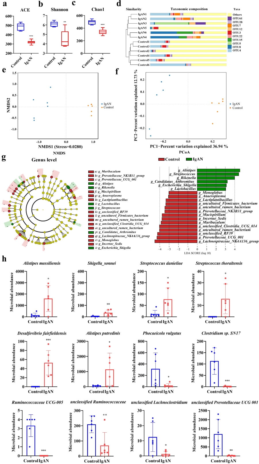 通过构建IgAN动物模型,作者发现与对照组相比,IgAN组的α多样性分析均显著降低。此外,采用非加权组平均法聚类(UPGMA树)分析、非度量多维尺度分析(NMDS)和主坐标分析(PCoA)进行相似性聚类分析。结果显示,IgAN组与对照组表现出明显的微生物聚类,两组间存在清晰的分组,表明IgAN诱导了微生物群落的转变。