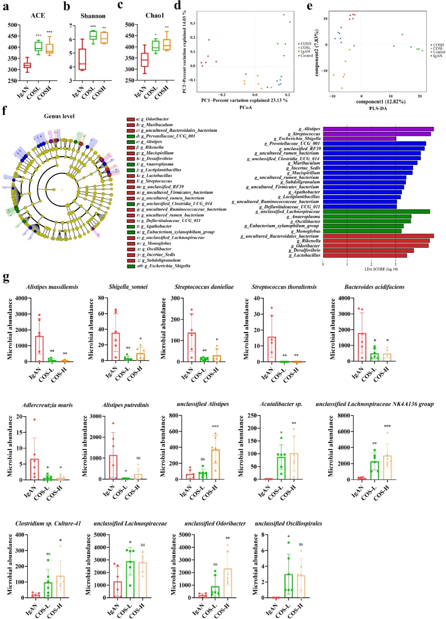 随后,作者为探索调节IgAN的特定微生物群是否能改善疾病进展,应用了COS对IgAN中失调的微生物群进行靶向调节。α多样性比较结果显示,经不同剂量COS干预后,IgAN小鼠模型的肠道微生物群整体得到恢复。β多样性分析(PCoA和PLS-DA)表明,与对照组相比,COS干预后的肠道微生物群表现出显著改变,其结构向对照组方向转变。