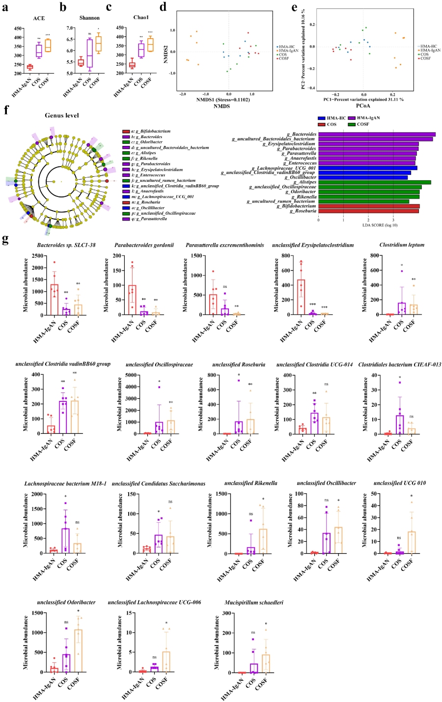 最后,作者在IgA肾病(IgAN)小鼠模型中,进一步给予COS和COSF(壳寡糖制剂)进行干预。结果显示,COS和COSF干预皆显著增加了HMA-IgAN小鼠肠道微生物群的α多样性指数,从而增加了肠道微生物群的丰富度。聚类结果显示,HMA-IgAN组的样本与对照组和干预组的样本明显分离,干预组样本倾向于与对照组相似。采用LEfSe分析比较了HMA-HC组、HMA-IgAN组、COS干预组和COSF干预组之间的差异微生物群,并鉴定了各组的差异微生物群。在属水平,COS可富集双歧杆菌(Bifidobacterium)和罗斯氏菌(Roseburia)。COSF组富集的微生物群包括普氏菌(Alistipes)、未分类的振荡螺菌科(Oscillospiraceae)、臭味杆菌(Odoribacter)、里肯氏菌(Rikenella)和未培养的瘤胃菌。