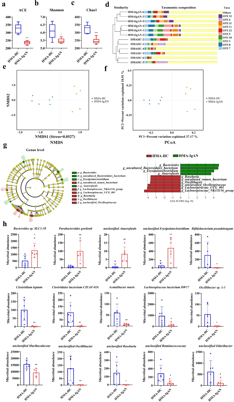 进一步分析发现:与HMA-HC组相比,HMA-IgAN组小鼠肠道微生物群的α多样性显著降低。β多样性分析显示,两组的聚类之间存在明显的分化。两组的微生物群特征也存在显著差异。在属水平上,HMA-IgAN小鼠表现出拟杆菌属(Bacteroides)、未培养的拟杆菌目细菌(uncultured Bacteroidales bacterium)、丹毒丝菌属(Erysipelatoclostridium)和厌氧梭菌属(Anaerofustis)的增加。相对应的种水平丰度也发生了显著的升高或降低,以上结果表明,HMA-IgAN小鼠模型可以诱导肠道微生物群多样性(ACE、Shannon和Chao1指数)的紊乱以及微生物群落结构的改变。
