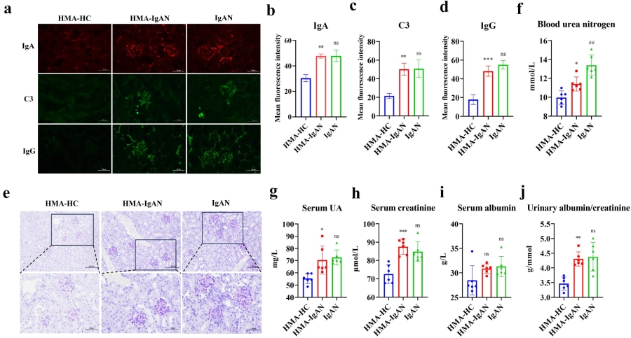 采用人类微生物群相关HMA-IgAN小鼠模型探讨小鼠模型与人类微生物群的差异,并计划验证IgAN诱导的人体肠道微生物群演变对小鼠肾功能的影响。肾免疫荧光显示,HMA-IgAN小鼠肾小球IgA(p < 0.01)、C3(p < 0.01)和IgG(p < 0.001)沉积与IgAN模型小鼠观察到的结果相似。PAS染色显示,HMA-IgAN小鼠肾小球系膜细胞显著增生伴炎性浸润,与IgAN模型组相似。与HMA-HC组相比,HMA-IgAN小鼠表现出与IgAN模型相似的肾损伤,血尿素氮(BUN,p < 0.05)、尿酸(UA,p <  0.05)、血肌酐(Scr,p < 0.001)和尿白蛋白/肌酐比(ACR,p < 0.01)显著升高。