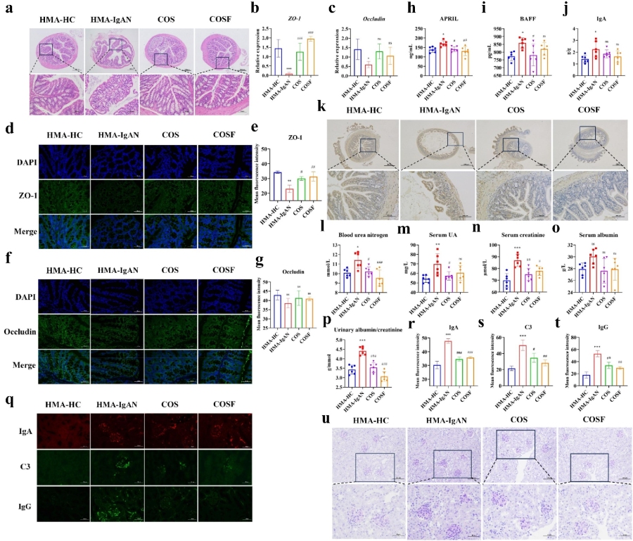 最后作者发现COS与COSF(壳寡糖制剂)皆显著改善了HMA-IgAN小鼠模型的各项肾功能指标,显著降低了UA(p < 0.05)、Scr(p < 0.01)、BUN(p < 0.05)和ACR(p < 0.001)水平。