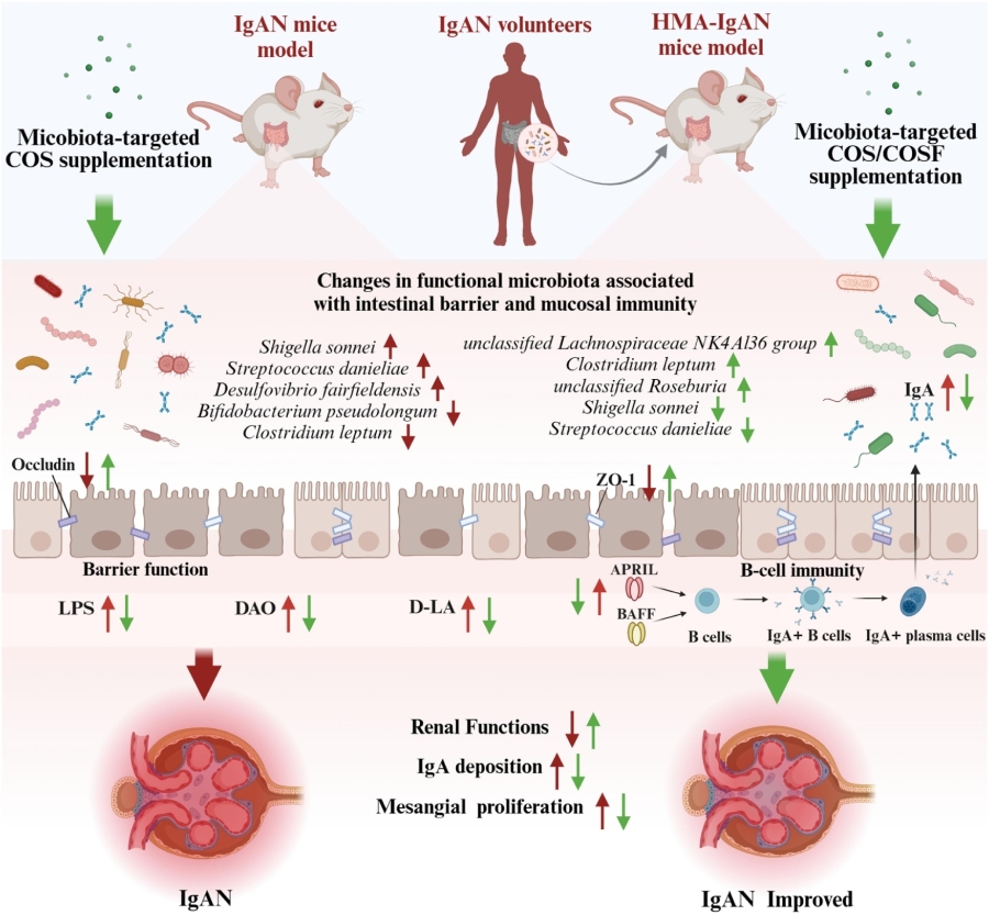 该研究采用IgAN和人类微生物群相关模型来研究IgAN对肠道微生物群改变的影响以及肠道微生物群的可能会触发 IgAN的机制。此外,本研究还发现了壳聚糖 (COS)和COS制剂(COSF)具有微生物群靶向功能,可增强肠道屏障和肾功能的作用。这些结果表明,IgAN可导致α多样性降低和肠道微生物群的结构改变。同时,肠道也出现了B细胞免疫失衡和紧密连接蛋白水平降低(ZO-1和Occludin)。而COS/COSF可通过靶向调节富集肠道屏障和粘膜免疫相关微生物群来增强肠道ZO-1表达,减少B细胞活化因子(BAFF)和增殖诱导配体(APRIL)过表达,从而减少IgAN中的肾损伤。