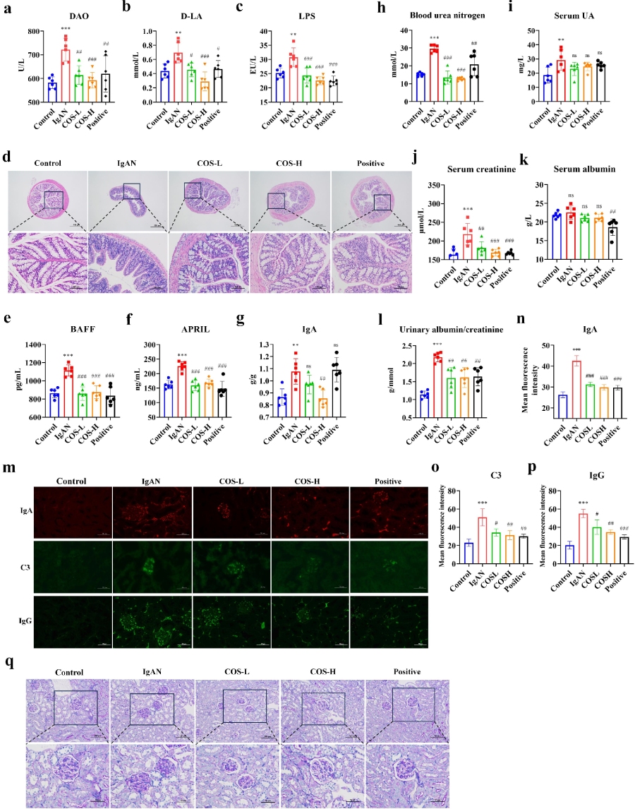 此外,作者进一步探讨了调节特定微生物群落对肠道屏障和黏膜免疫的影响。结果显示,COS干预组显著改善了肠道通透性指标。对D-LA和LPS的改善效果呈剂量依赖性,其中COS-H组的改善效果最佳。阳性对照组也显示出对IgAN模型引起的肠道损伤的改善。H&E染色还显示,COS干预导致结肠结构清晰完整,肠腺排列规则,趋于正常化。