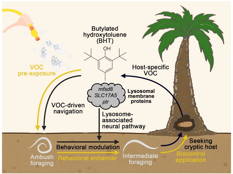 在机制层面,研究进一步从行为调控角度出发,通过对暴露于BHT的线虫进行转录组测序,解析了溶酶体相关神经通路在这一过程中所起的作用。结果表明,寄主挥发物信号能够通过影响线虫体内相关转运系统与代谢状态,进而改变其神经活动与行为输出。研究成功将化学信号、能量代谢与行为响应建立起关联,体现了从生态现象到生理调控的跨层级认知整合。在应用基础层面,该研究为生物防治技术的发展提供了新的思路。通过利用寄主挥发物或模拟信号对线虫进行“生态预激” ,可实现对生防线虫行为的精准调节,从而提升其在隐蔽性或钻蛀型害虫(如红棕象甲、番茄潜叶蛾等)防控中的效率,减少化学农药依赖,推动农业绿色发展。这一成果不仅拓展了生物防治的技术边界,也为农业生物安全提供了新的科学支撑。