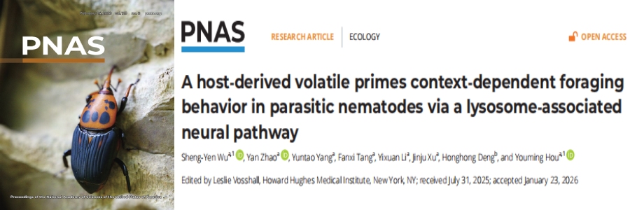 2026年2月25日,福建农林大学侯有明院长教授/吴升晏教授团队在国际权威期刊PNAS发表研究成果并入选封面论文。题为《A host-derived volatile primes context-dependent foraging behavior in parasitic nematodes via a lysosome-associated neural pathway》。