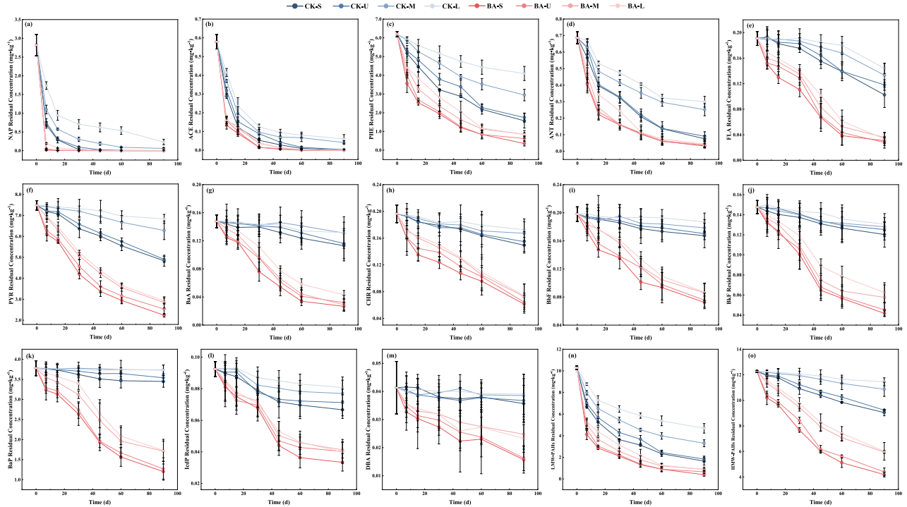 - 对比 BA 组与 CK 组 90 天内 16 种 PAHs 及低 / 高分子量 PAHs 在不同土壤层的残留变化,量化高浓度污染物的去除效率与降解速率差异。