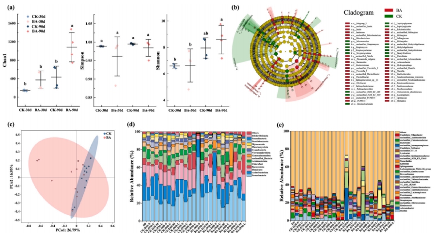 - BA 处理重构了土壤微生物群落,显著提升群落丰富度与均匀度,促进 Achromobacter、Rhodococcus 等功能降解菌富集并成为特异性标志物。