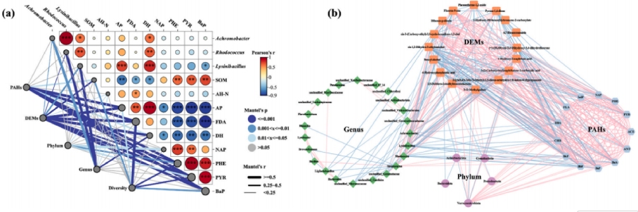 - 借助 Mantel 检验与共现网络分析,量化 PAHs 降解、微生物群落、代谢物及土壤环境因子间的相关性,阐明协同降解机制。