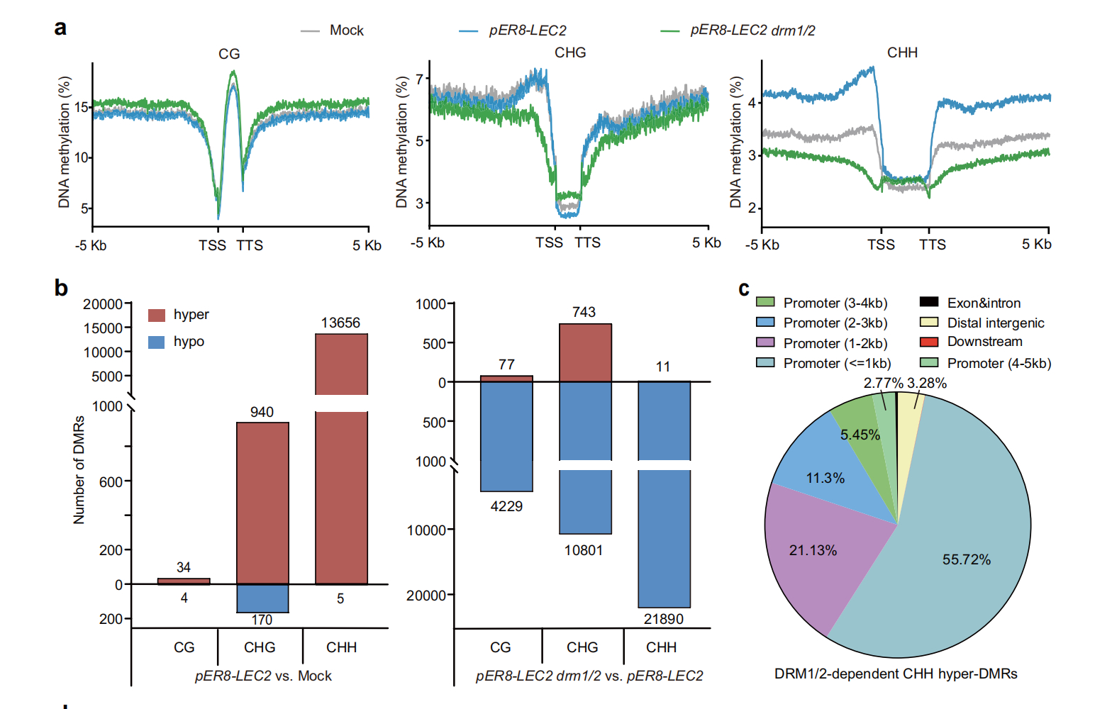 LEC2过表达通过激活DRM2/RdDM通路介导CHH高甲基化激活多能性调控基因过表达 LEC2 可显著上调 RdDM 通路核心基因表达,其中 DNA 甲基转移酶DRM2是 LEC2 的直接靶基因,LEC2 通过结合 DRM2 启动子区域的 RY 基序直接激活其转录。全基因组甲基化测序(WGBS)表明,LEC2 诱导后,基因组CHH 位点发生特异性高甲基化,CG 与 CHG 甲基化水平无显著变化,且 CHH 高甲基化区域主要富集于全能性调控基因的启动子区域。敲除 DRM1/2 会显著抑制 LEC2 诱导的体细胞胚胎发生,证明DRM2/RdDM 通路介导的 CHH 高甲基化是体细胞重编程的必要条件。