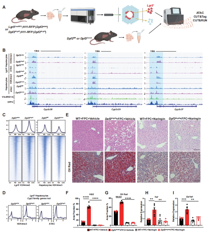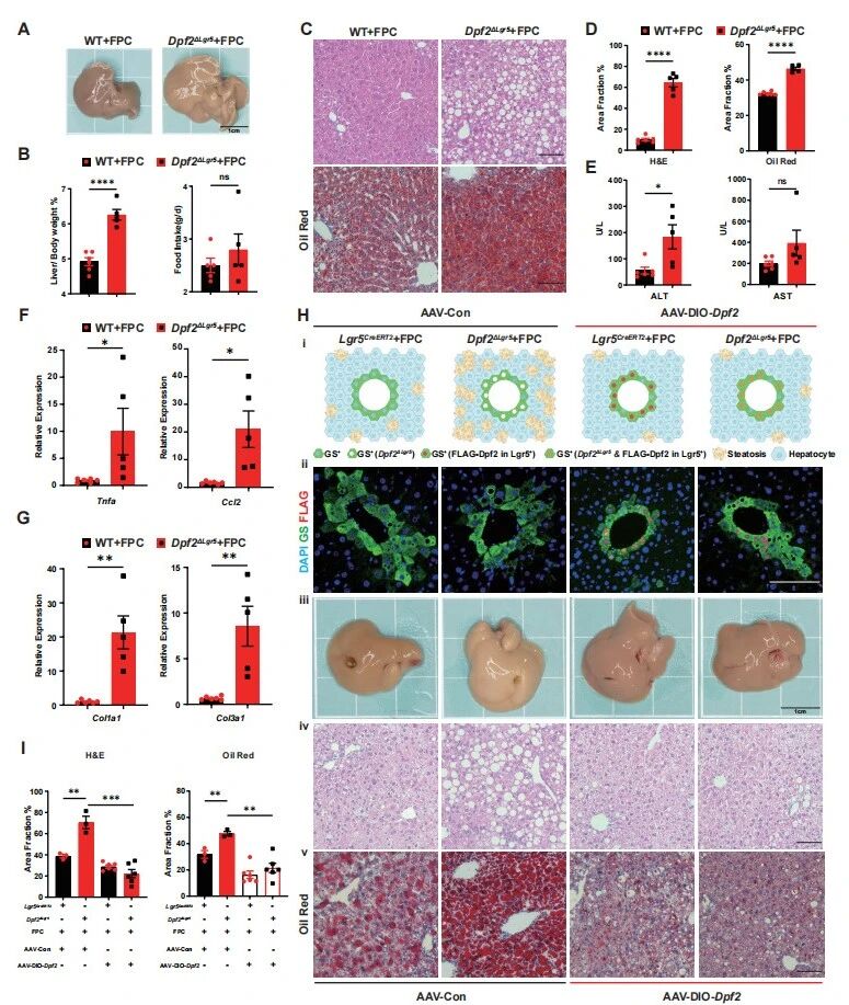 为进一步验证Dpf2在MASLD中的调控作用,作者采用FPC饮食(果糖-棕榈酸-胆固醇饮食)诱导更贴合临床特征的MASLD模型,发现FPC饮食喂养28天后,Dpf2ΔLgr5小鼠肝脏体积、肝重/体重比显著升高,肝脏脂质沉积、炎症因子(Tnfa、Ccl2)和纤维化相关基因(Col1a1、Col3a1)的表达水平均显著高于WT对照组,肝损伤指标ALT/AST持续升高(图2A-G)。