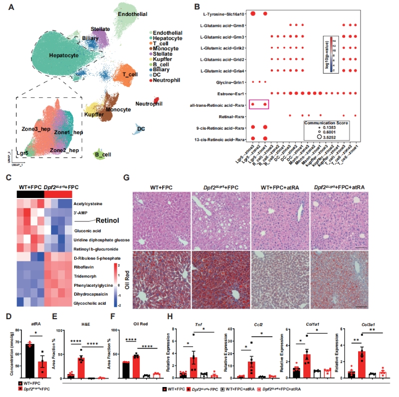 功能回补实验验证了该通路的核心作用:给FPC饮食喂养的小鼠外源性补充atRA,可显著缓解肝脏脂质沉积、炎症与纤维化表型,同时逆转Dpf2缺失导致的MASLD损伤(图3E-H),证实Lgr5+肝细胞正是通过调控atRA的代谢稳态,实现对全肝代谢的非细胞自主调控。