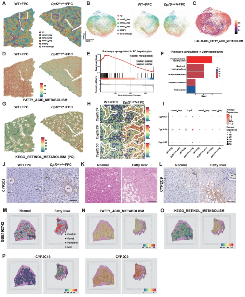 免疫组化验证与临床转化分析同步完成:小鼠肝脏IHC染色证实Dpf2ΔLgr5小鼠中央静脉周围区的CYP2C9、CYP2C19(Cyp2s的人源同源基因)蛋白水平显著升高(图4J);人源脂肪肝临床样本的H&E、IHC染色,以及公共数据库中人源MASLD样本的空间转录组数据分析,均证实脂肪肝患者肝脏中存在CYP2s基因的表达上调与视黄醇代谢通路的异常激活(图4K-P),完成了从动物模型到人类疾病的转化验证。