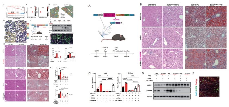 通过体内功能获得与缺失实验,作者完整验证了atRA-AMPK轴的核心作用:通过尾静脉水动力注射组成型激活的AMPK(CA-AMPK)质粒,或使用AMPK激动剂A-769662干预,均可显著逆转Dpf2ΔLgr5小鼠的严重MASLD表型;采用zone1/2肝细胞特异性启动子驱动的AAV-Gls2-CA-AMPK靶向回补,同样可显著缓解肝脏脂质沉积,证实AMPK是atRA下游的核心效应分子(图6E-K)。在小鼠肝脏中过表达显性负突变的AMPK(DN-AMPK),可完全阻断atRA对MASLD的保护作用,证实atRA的肝脏保护效应完全依赖于AMPK信号通路的激活(图7A-E)。