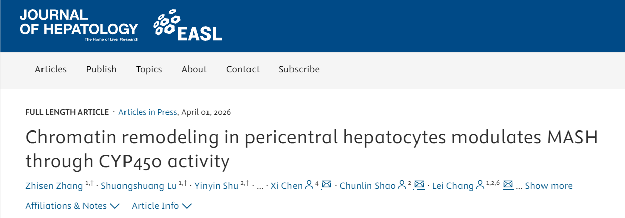 2026年4月1日,肝病学国际知名期刊Journal of Hepatology在线发表了苏州大学、复旦大学、南方科技大学等单位联合完成的重磅研究成果:“Chromatin remodeling in pericentral hepatocytes modulates MASH through CYP450 activity”。
